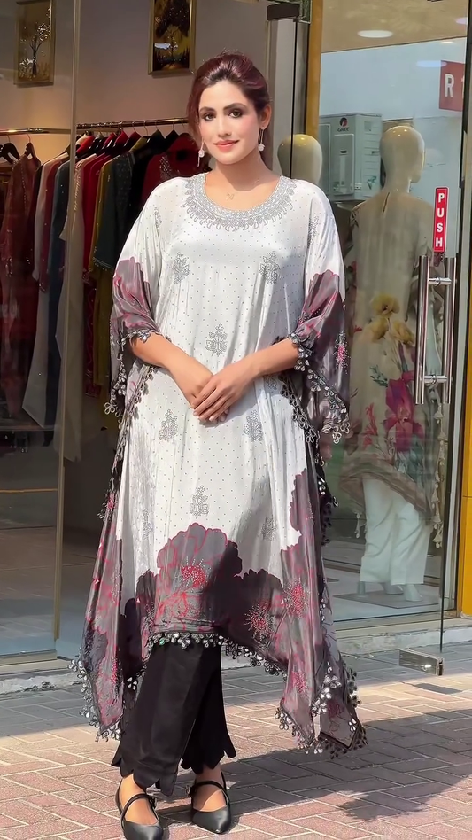 Elegant White Embroidered Kurti Set with Printed Dupatta – Festive Wear
