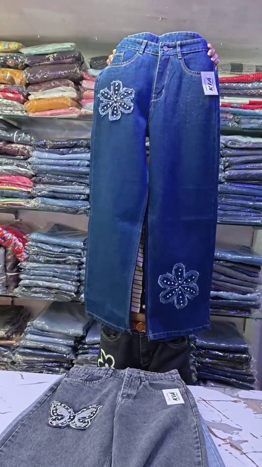 Floral & Butterfly Embellished Wide-Leg Denim Jeans